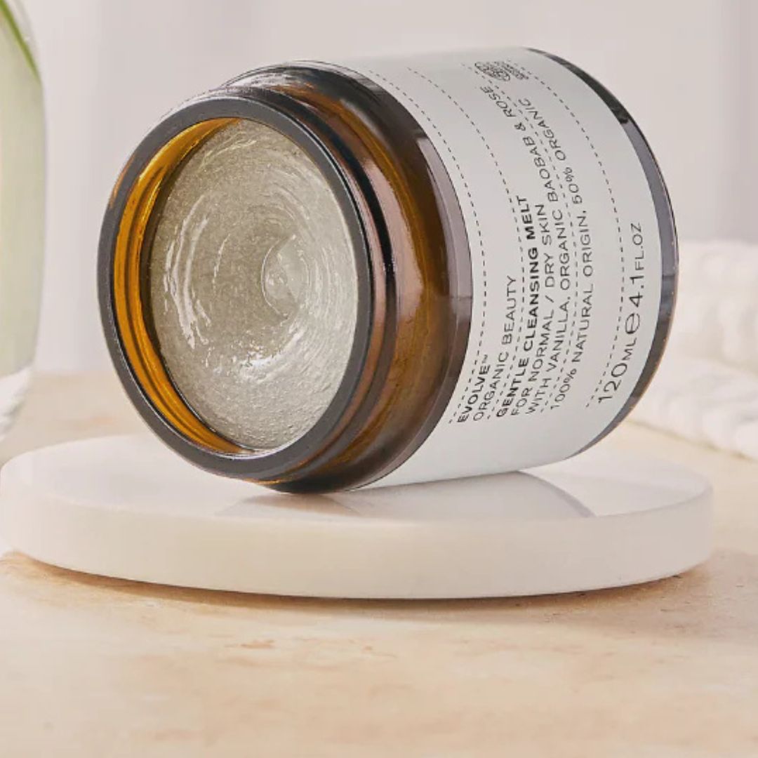 Evolve gentle cleansing melt contains organic baobab oil that soothes and hydrates. Natural sugar extracts gently combine with water to turn into a creamy milk that rinses away clean, leaving skin calm and hydrated.